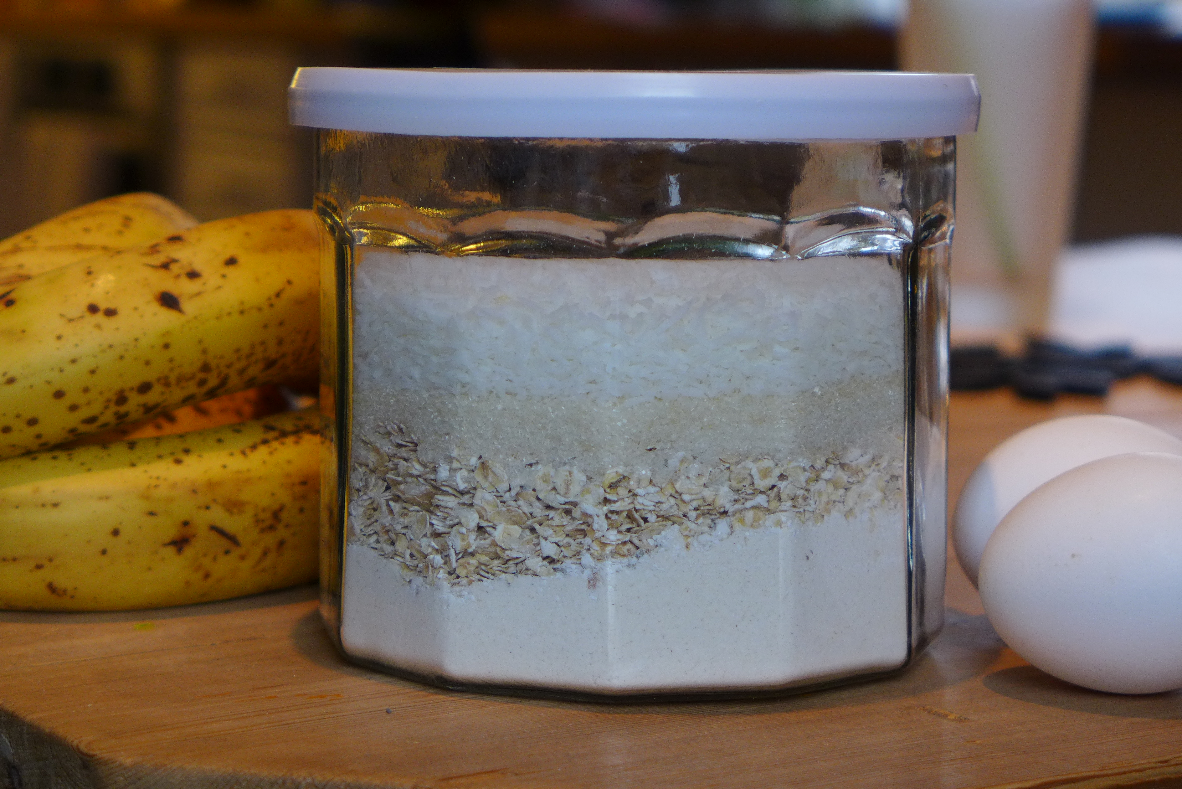 Planning a long week-end at our summerhouse, with a weather forecast promising rain and cold wind the whole stay, I had to make som preparations. I mixed the ingredients for the banana bread in a glass container, so all we had to do was mix it with the bananas and eggs, then put it in the oven.