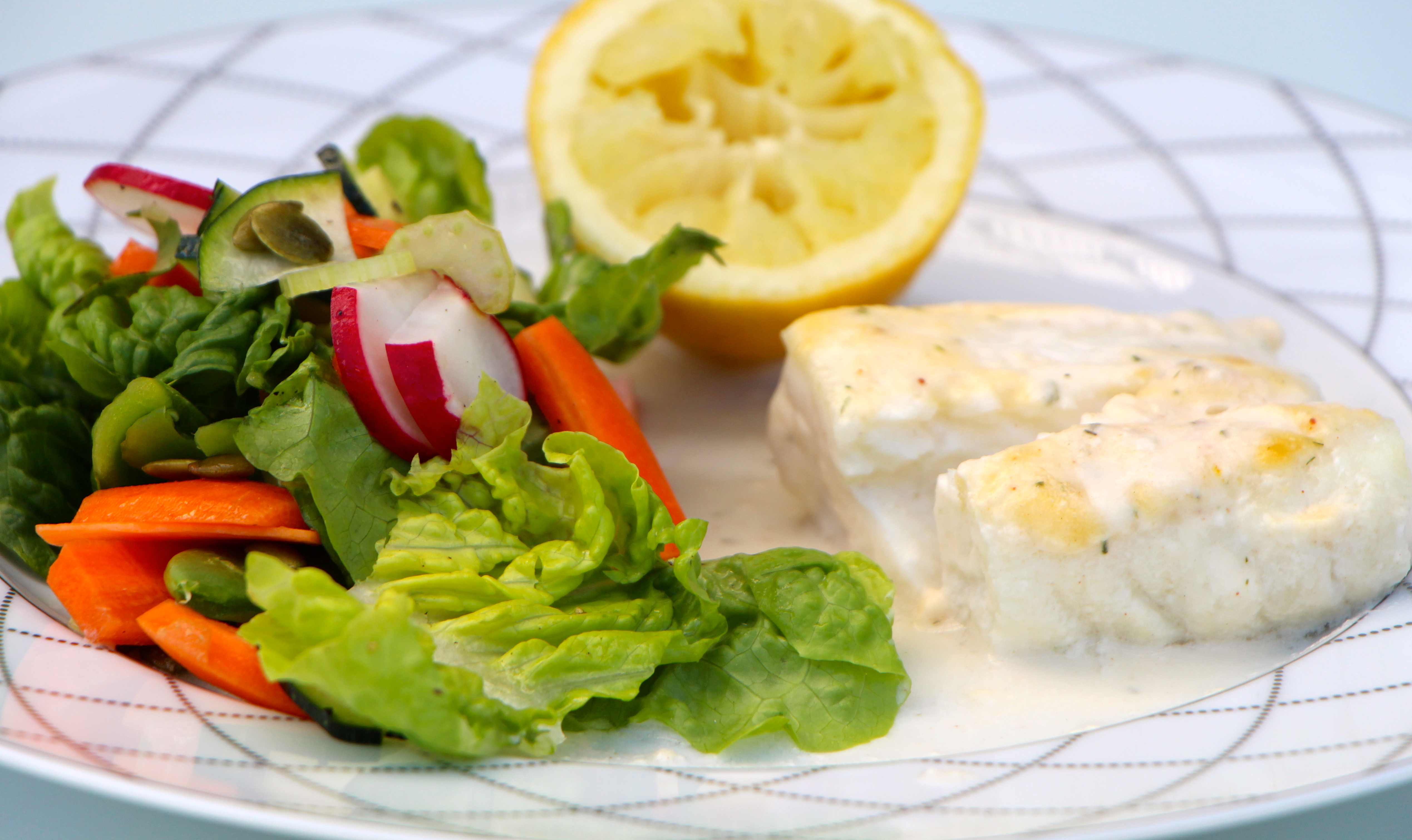 Pour over the fish and put i the pre-heated oven for 20-25 minutes (check after 15 minutes. If it falls apart- it’s ready!). Squeeze some lemon juice over the fish just before serving.