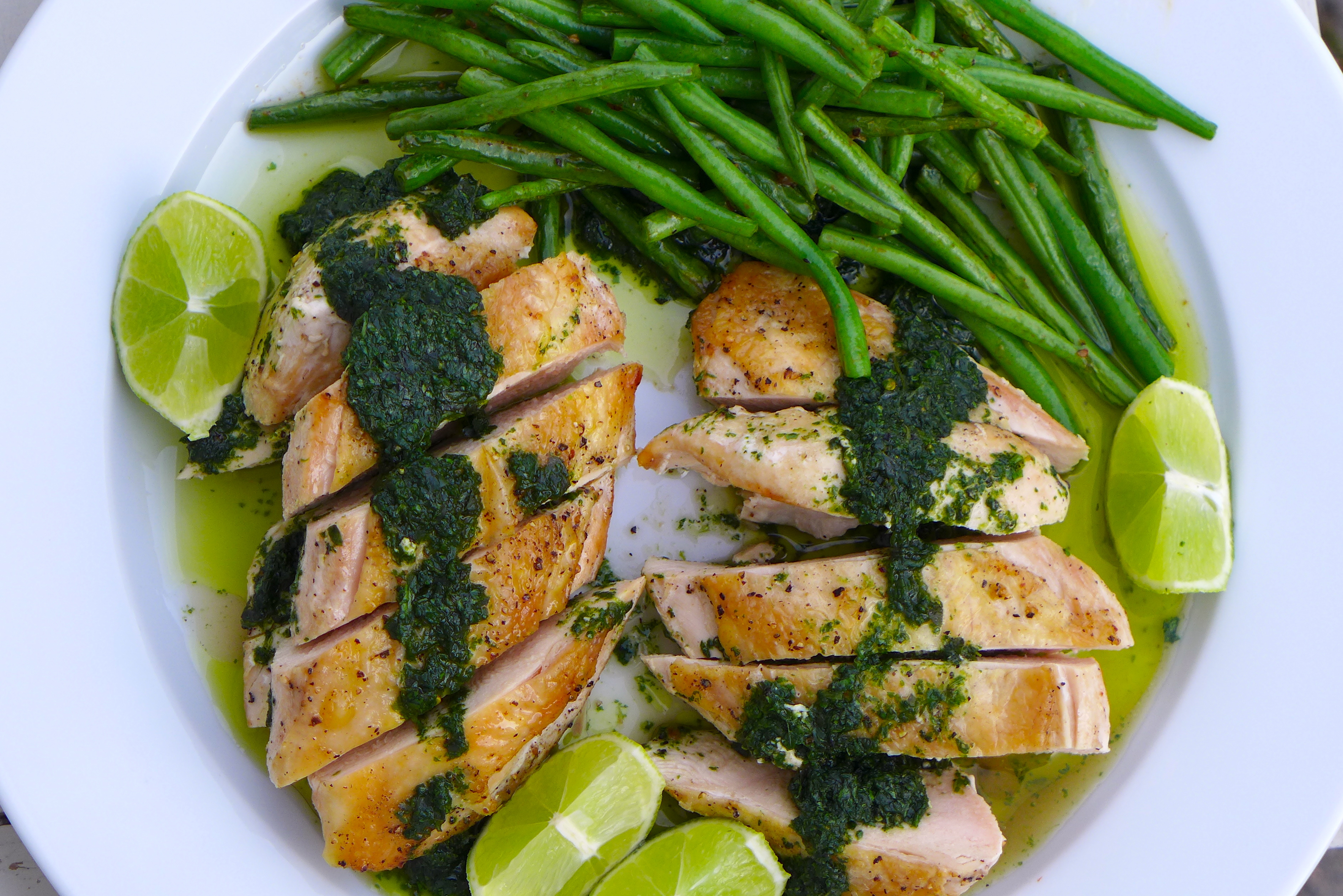 Just before serving, fry the green beans in the frying pan with all the lovely juices from the chicken. Cut the chicken in pieces and pour the juices and marinade over. Serve with potato wedges, aioli and the lime for squeezing over the chicken.