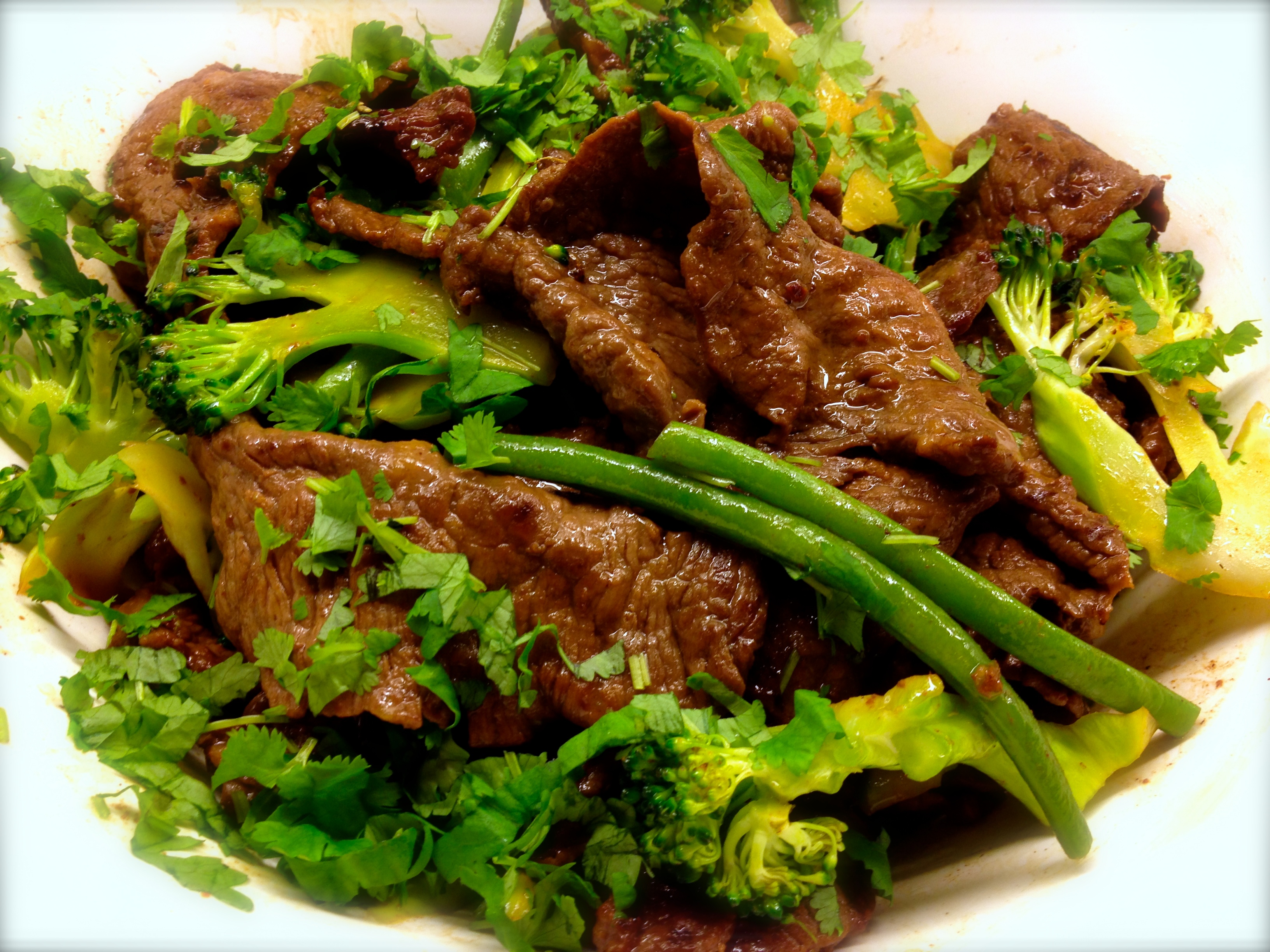 Thinly sliced fillet of beef marinated in soy sauce, garlic and honey, served with crispy vegetables. I use green chillies for the freshness, and dried chillies for the heat.