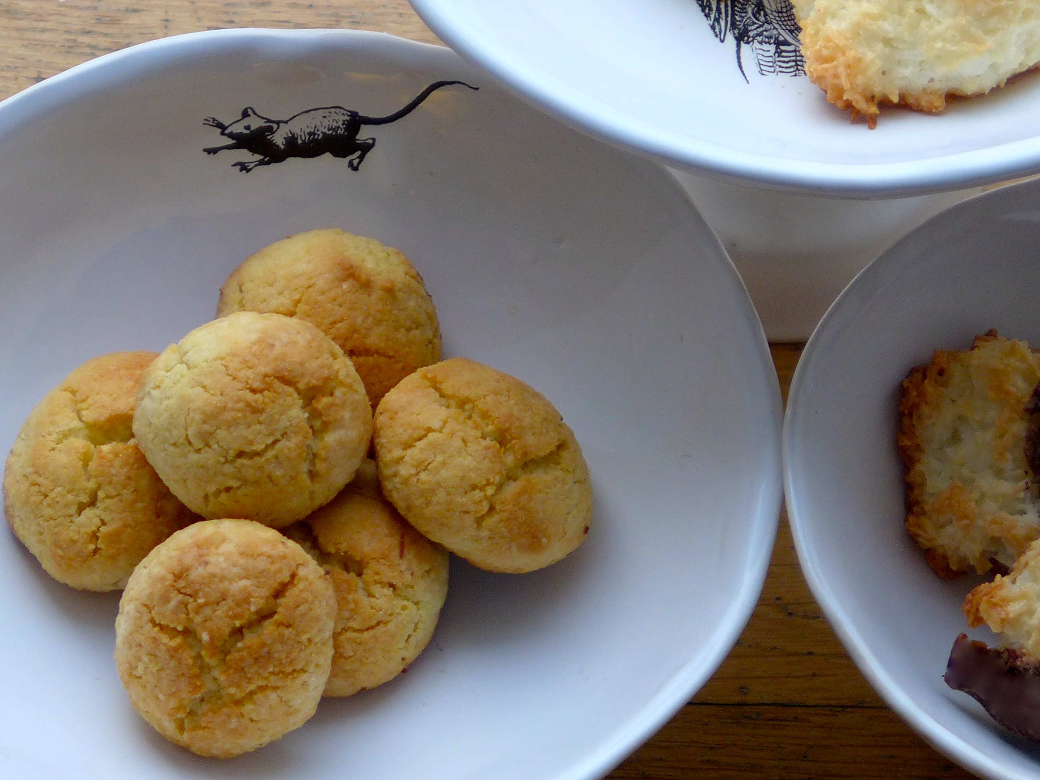 Kokosmakroner med og uten sjokolade, og gode små sprø mandelkaker er gode alternativer når man får gjester som ikke tåler gluten. Mandelkakene ble til litt på sparket, da jeg ikke hadde glutenfritt mel i huset. Denne gangen brukte jeg noen dråper ekte økologisk vaniljekstrakt. Det luktet deilig av mandel og vanilje i hele huset. Neste gang tror jeg jeg skal teste ut kakene med litt revet økologisk sitronskall.
