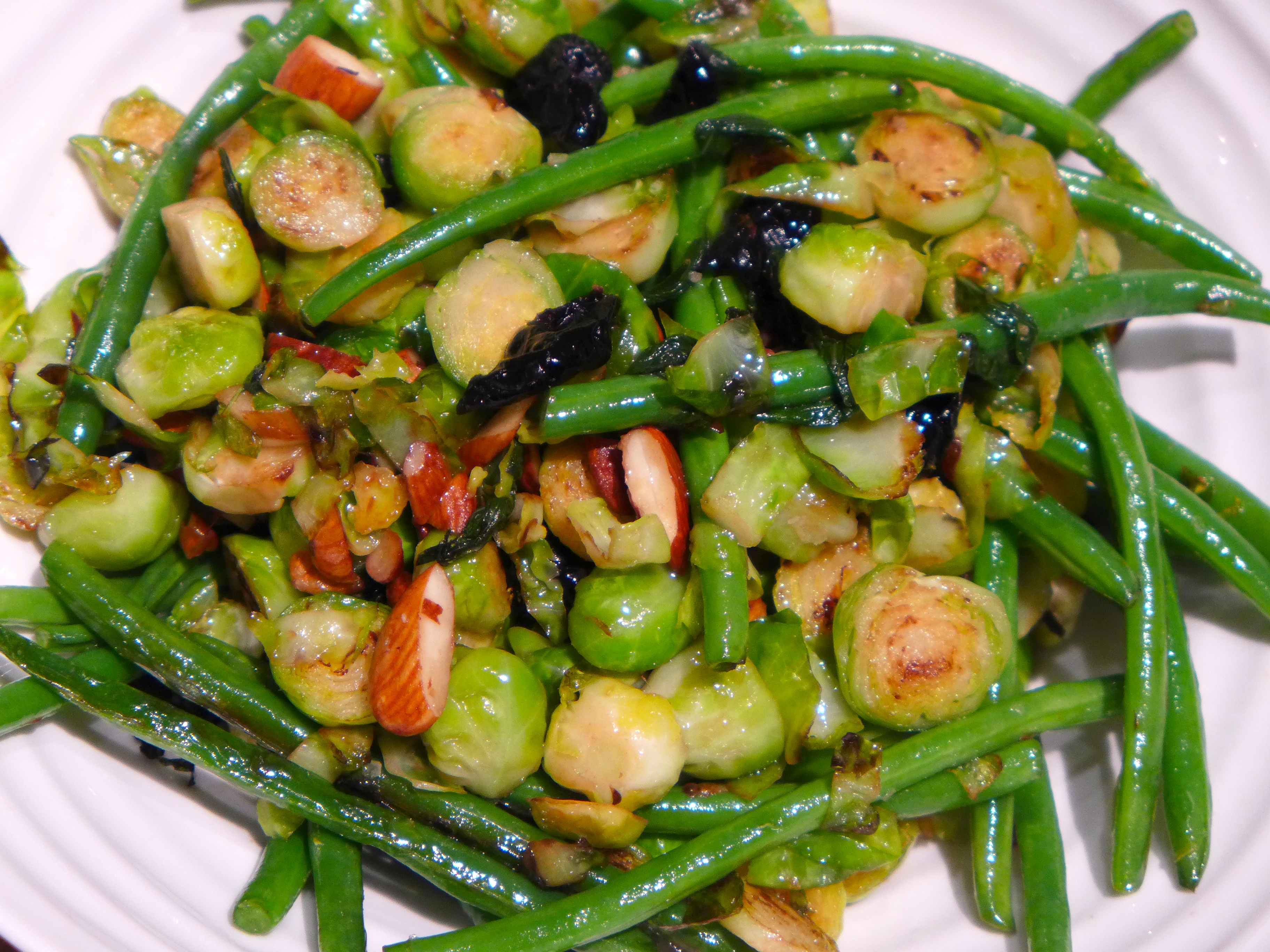 A lovely side dish bursting with health! It came to live when I was going to serve venison but didn’t feel like the traditional side dishes. Frying the brussel sprouts in butter and oil, gives them a lovely nutty flavor. The almonds give crunch and the sour cherries the sweet and sour edge.