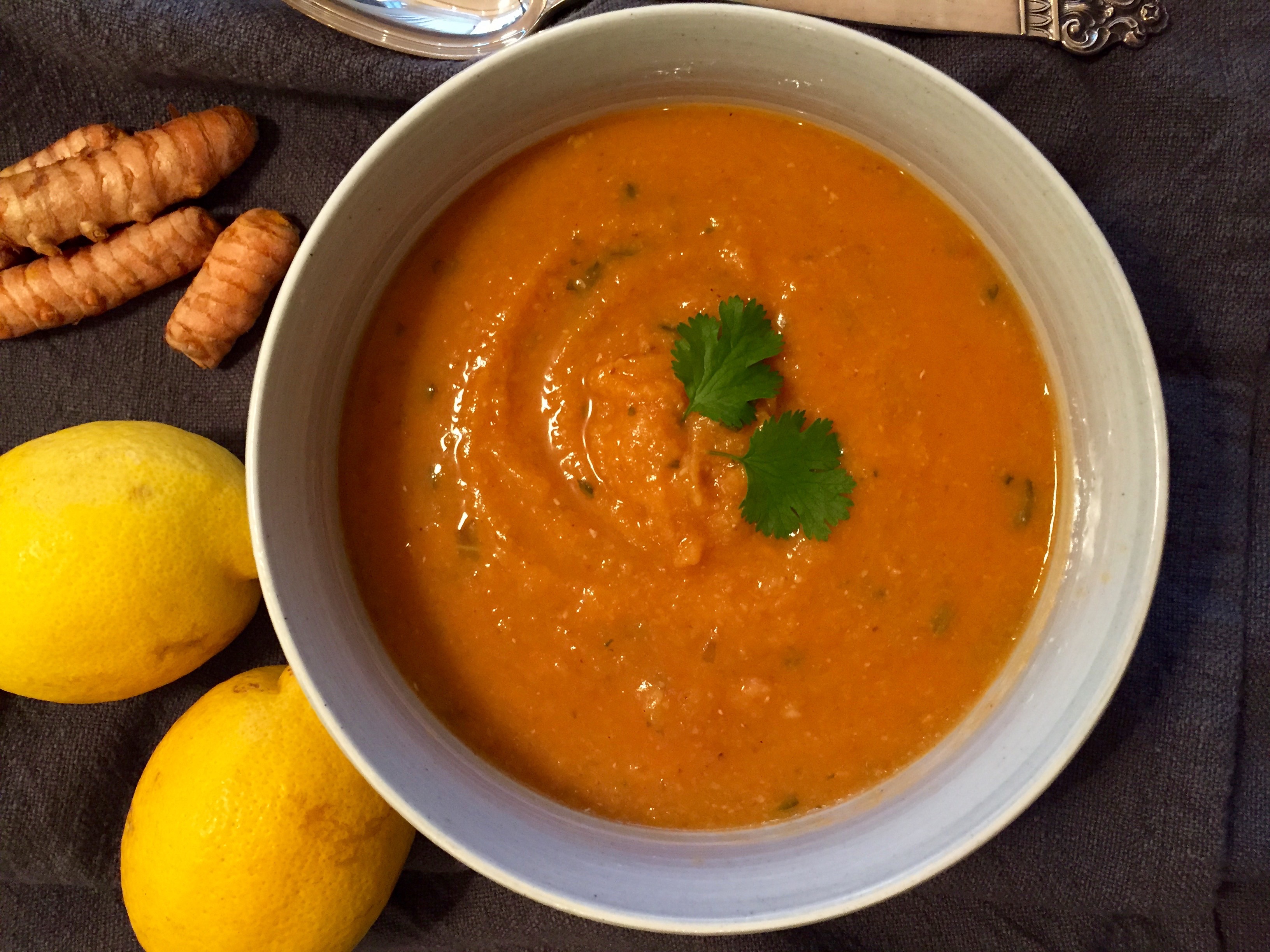 Jeg liker høsten. Og nå kan vi begynne å sense at luften ‘lukter’ litt annerledes på kvelden, og at tankene begynner å lengte litt etter ull, stearinlys og gode, smakfulle, varmende retter. Denne suppen er alt dette, og i tillegg proppfull av næringsrike ingredienser; linser, søtpotet, gurkemeie, krydder og urter. Jeg lager ofte en stor porsjon så vi har suppe til lunsj eller forrett en dag eller to etter også.