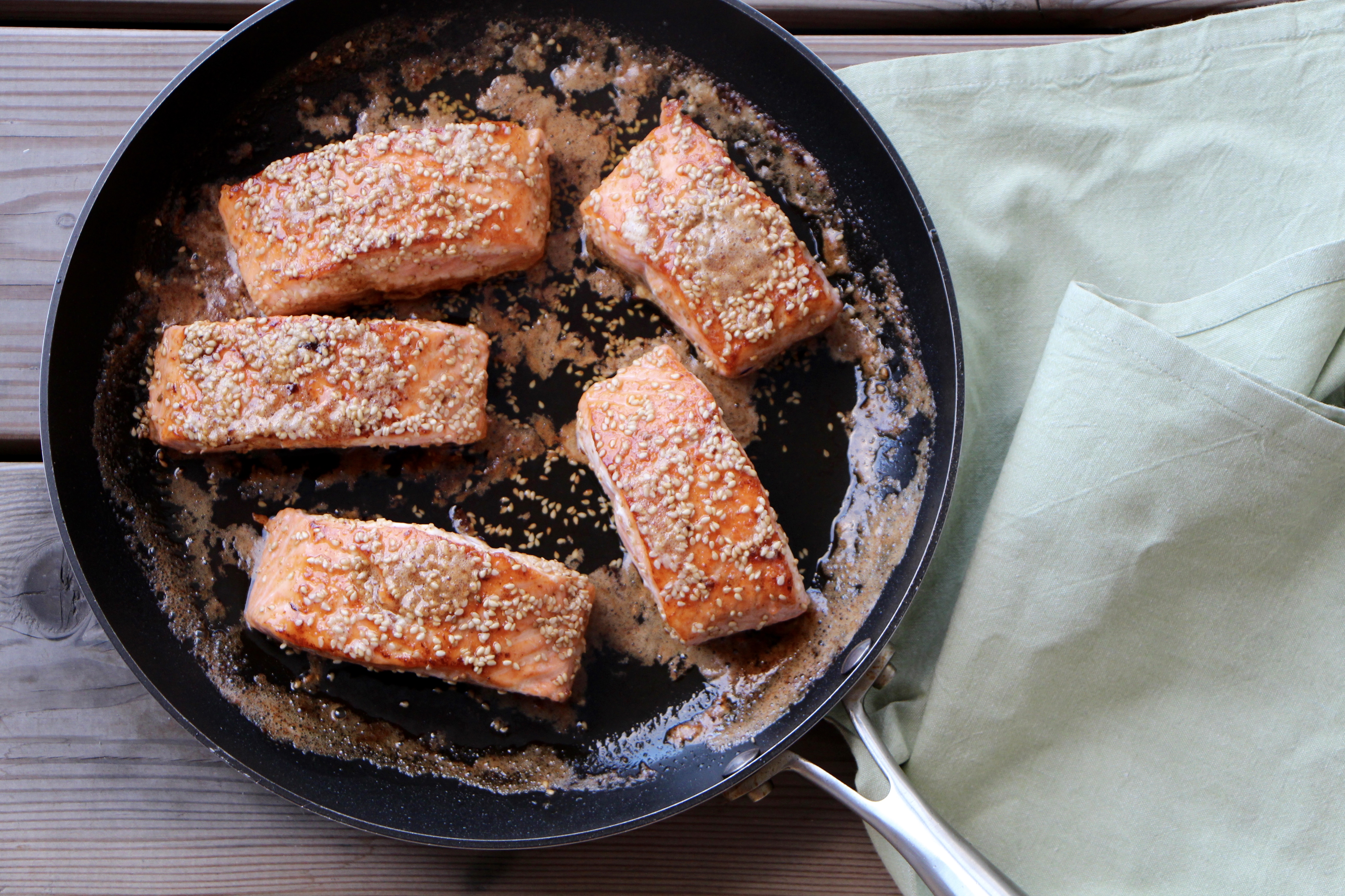 Dette er en enkel, rask og veldig smakfull måte å tilberede laksefilet på. Ettersom det er mye sødme i både laksen og sausen, er det godt å servere den med noe friskt og syrlig. Det kan være så enkelt som en grønn salat med sitron-vinaigrette, eller en råkostsalat med dressing av lime, soyasaus, litt sesamolje og revet ingefær.
