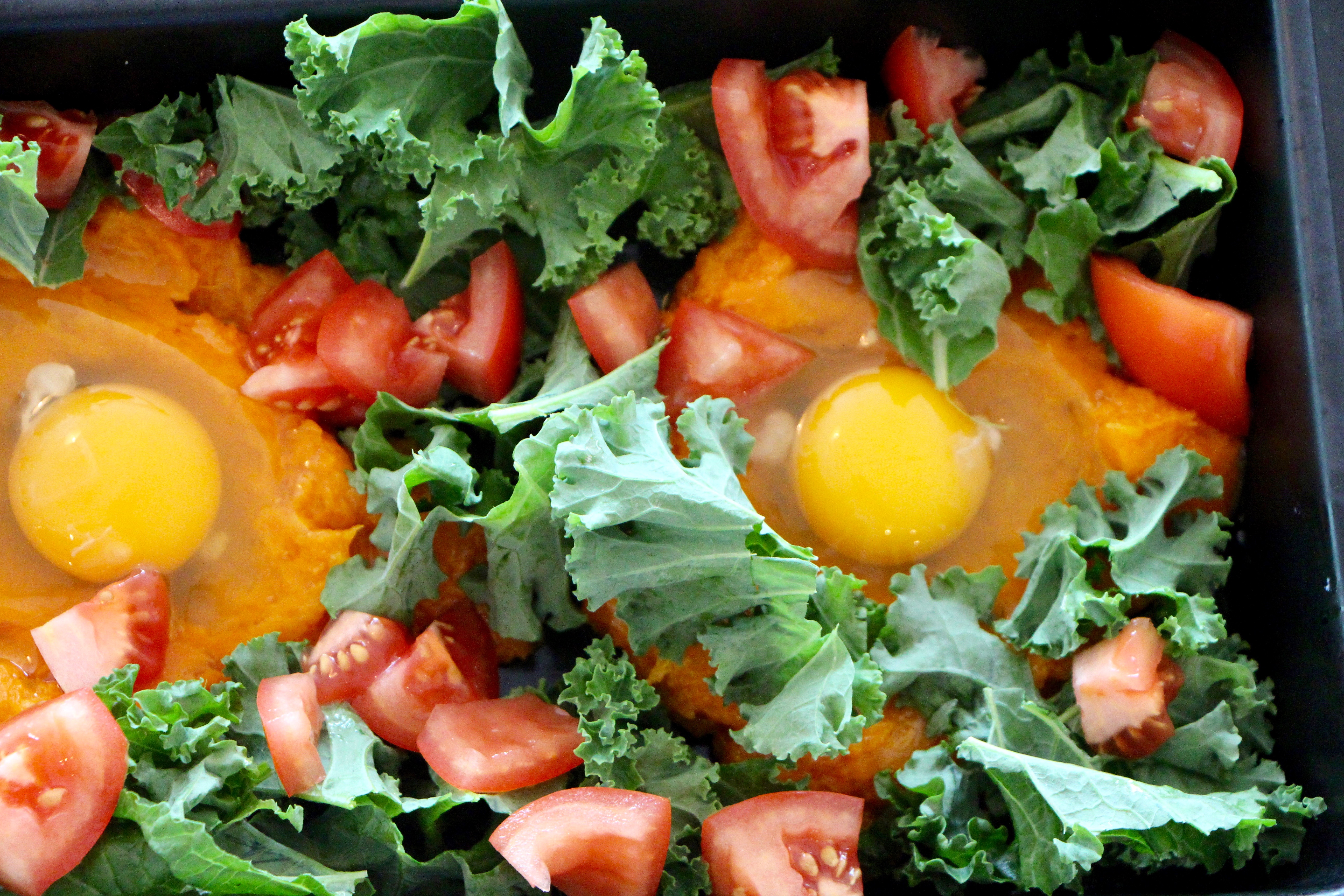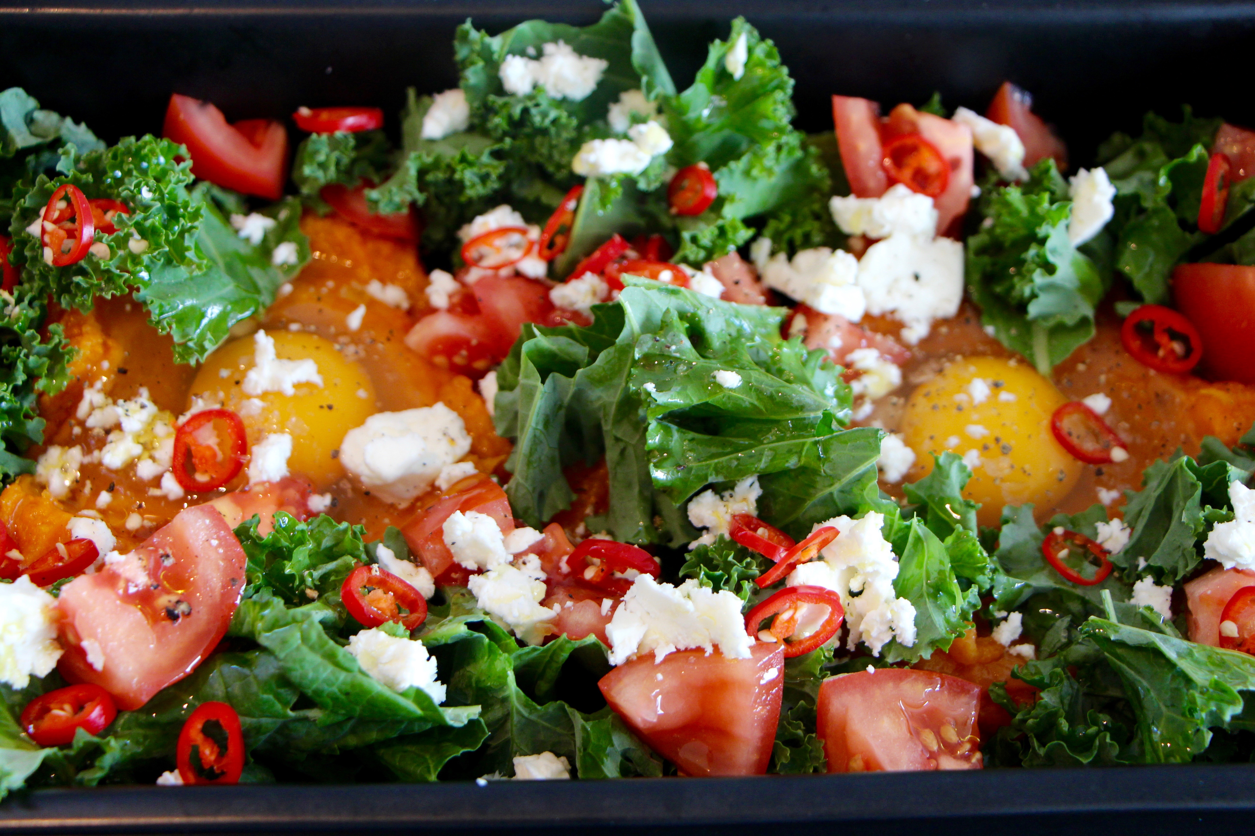 Smør en form med litt kokosolje eller annet fett. Legg en ‘kladd’ med søtpotetmos til hver person og lag en liten grop. Putt ett egg i hver grop. Dryss over tomater, fetaost, grønnkål og chili, og dryss over litt olivenolje, Maldonsalt og pepper.