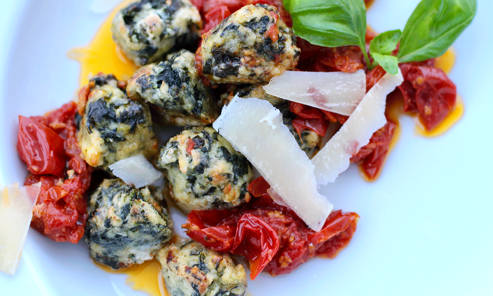 Gnocchi med hjemmelaget ricotta er så godt! De er lette og fluffy med en deilig konsistens og god smak. Her serverer jeg dem med magisk tomatsaus og høvlet Parmesan.