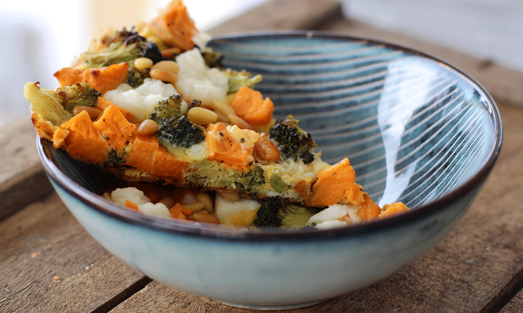 Legg søtpotetbitene i en form og gni dem godt inn med 1-2 ss olivenolje, salt, pepper og litt kayennepepper. Stek dem i ovnen til de begynner å få litt farge, men fortsatt er litt rå i midten. Bland så i brokkoli og hvitløk og rør om. Tilsett litt mer olje om du synes det trengs. Stek videre i 8-10 minutter til grønnsakene er godt brunet i kantene.