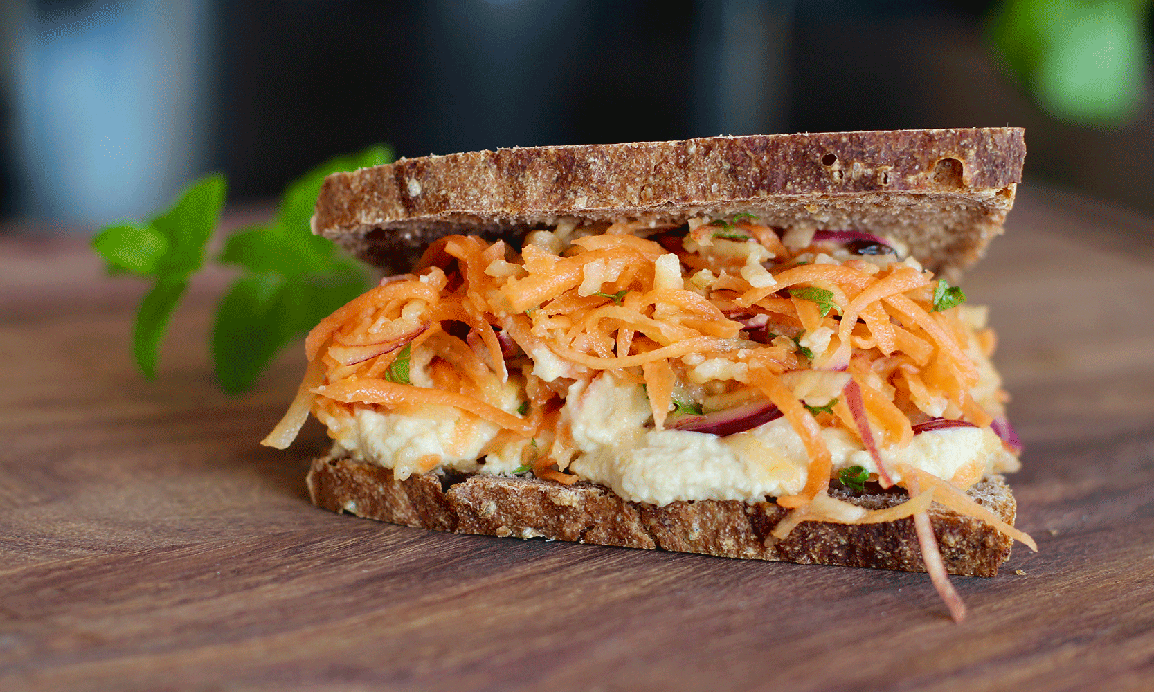 Legg hummus og grønnsakene mellom to skiver brød og servér. Noen ganger serverer jeg det på lefser/wraps. Det er også veldig godt 😉