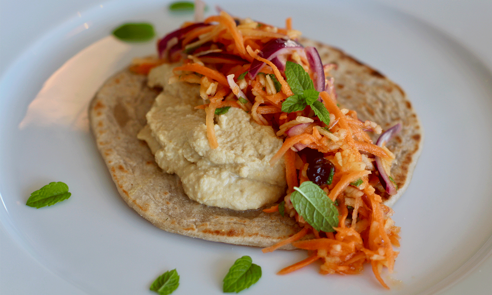 Bland gulrøtter, epler, rosiner, hakkede urter, olivenolje og smak til med sitronsaft, cayennepepper, zataar om du har og salt og pepper.