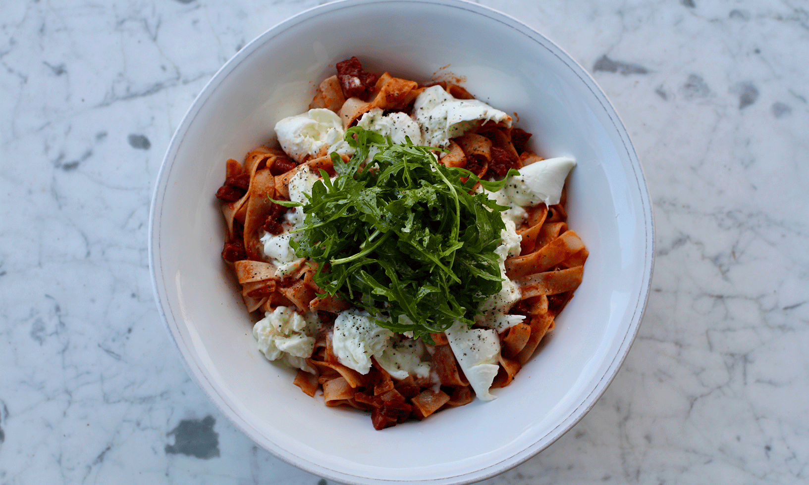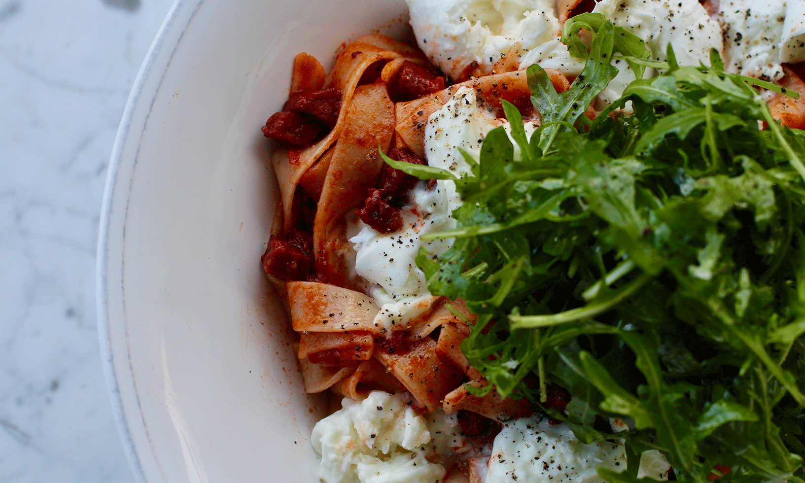 Denne fantastiske retten er enkel og rask og lage, men smakene er langt fra enkle. Sausen er dyp og kraftig med spicy chorizopølse kokt inn med tomat og chili, og evt litt rødvin. Iskald, mild og kremet bøffelmozarella rives i biter over den rykende varme pastaen, og til slutt toppes retten med crispy pepperaktig ruccola. I’m in heaven!