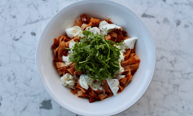 Når pastaen er ferdig, blander du den i sausen, evt sammen med 1 dl av kokevannet for å løsne sausen litt. Riv mozarella i gode biter og legg over, og topp det med en håndfull ruccola. Resten av salaten kan serveres ved siden av.