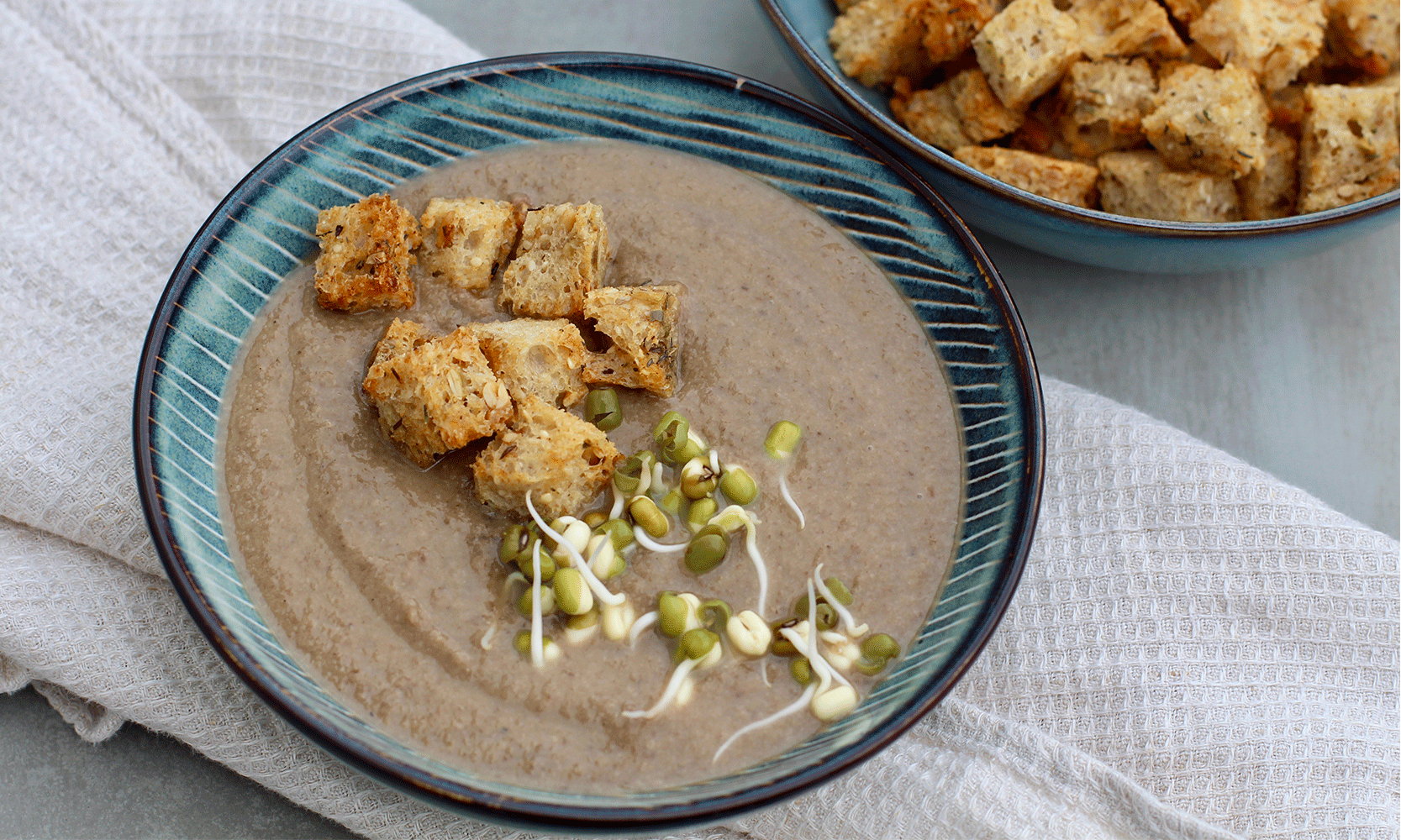 Jeg hadde en stor eske økologisk sopp i kjøleskapet og fikk derfor en trang til å lage en varm mettende suppe med dem. Denne deilige suppen er inspirert av en oppskrift av Sarah Britton. Den er tyknet med kokte bønner, og om du ønsker at den skal være både glutenfri og laktosefri, så bruker du Tamari i stedet for Soyasaus og dropper krutongene.