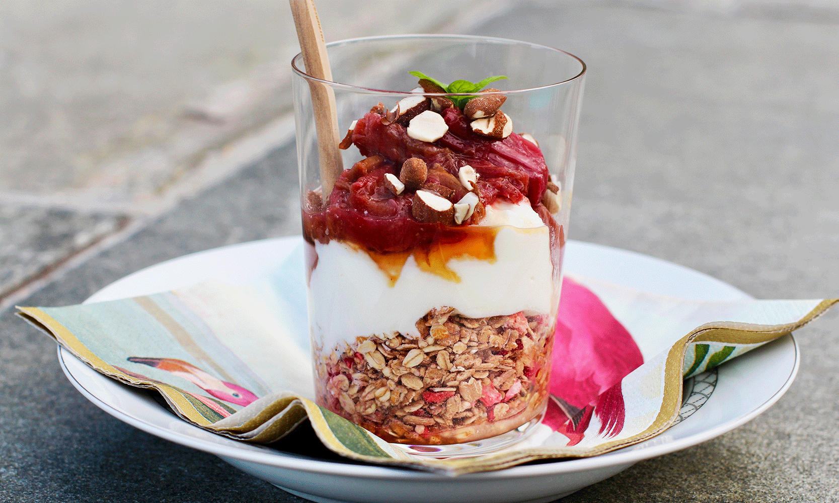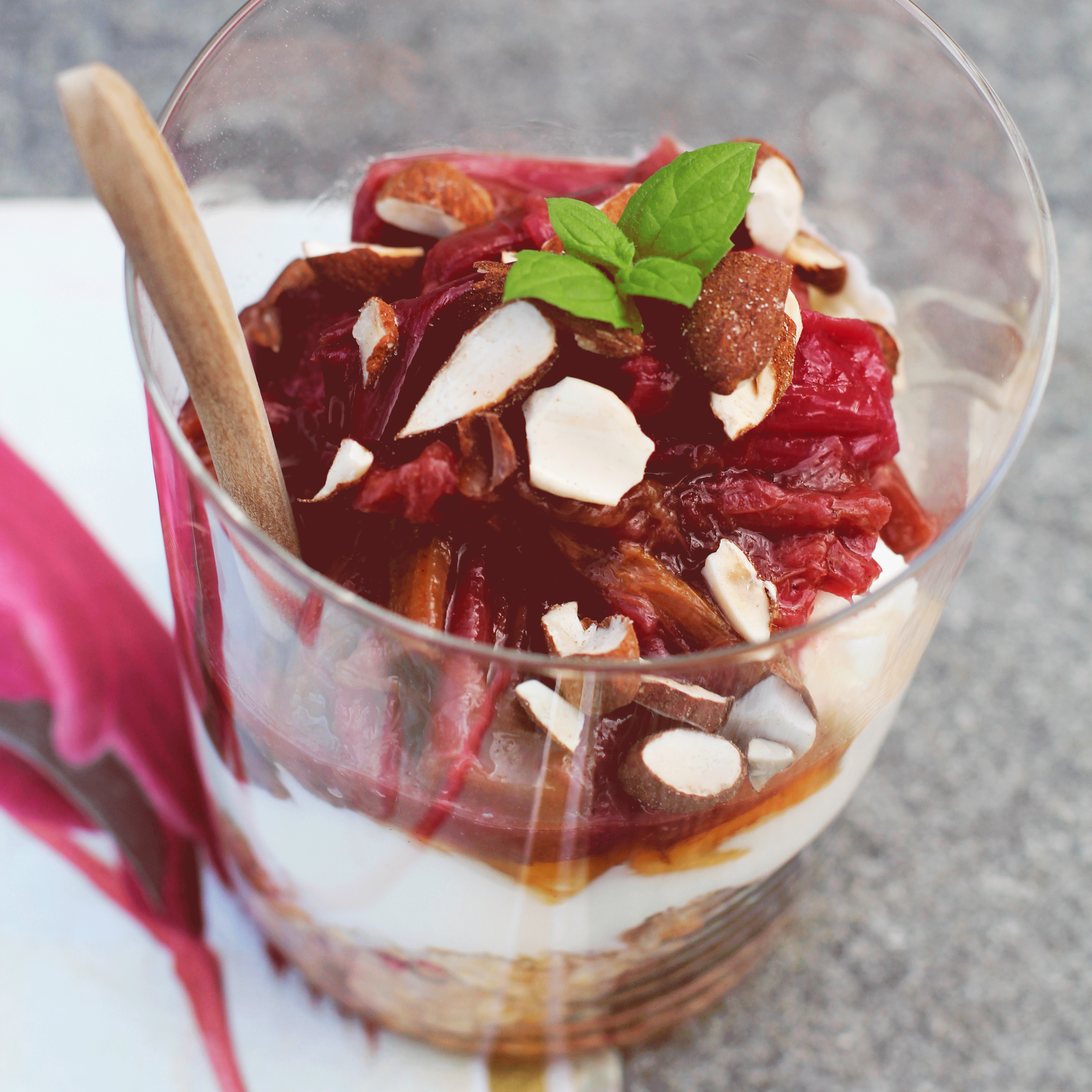 I fire store glass fordels granola, yoghurt og rabarbrakompott. Rabarbrakompotten er ikke så søt, så om du ønsker kan du helle over litt mer lønnesirup. Dryss over mandler og pynt med mynteblader.