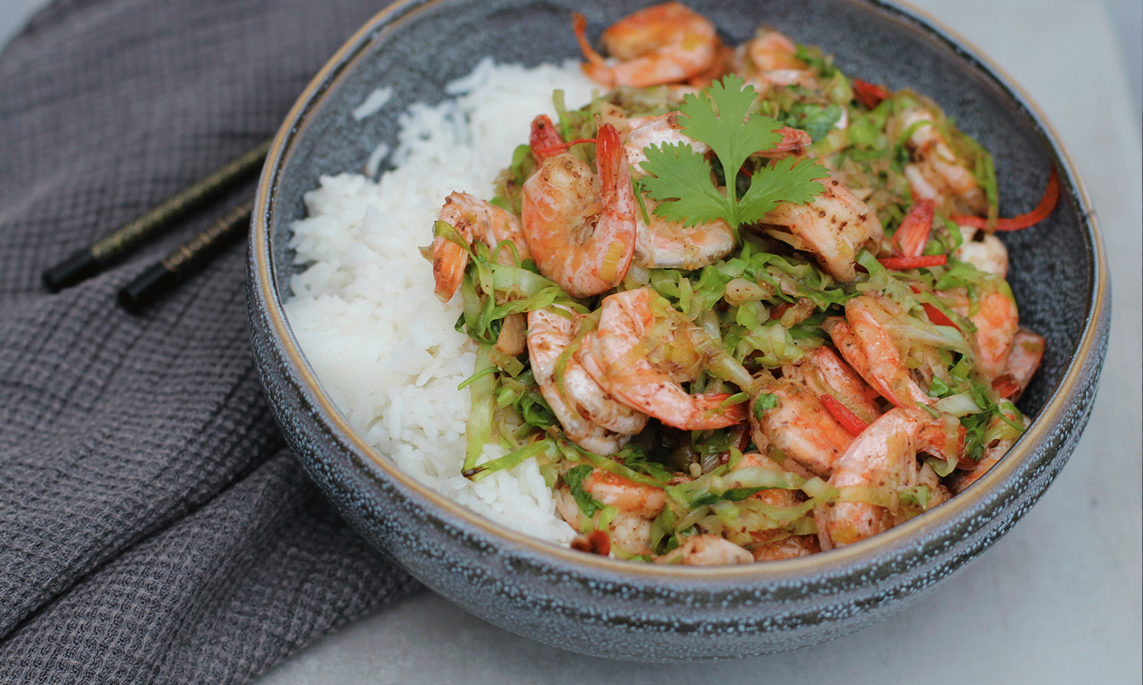 Varm opp 2 ss olje i en veldig varm wok eller stekepanne. Stek kongerekene mens du hele tiden rører. Når de så vidt har blitt rosa, tar du dem ut av pannen og legger dem på tørkepapir.