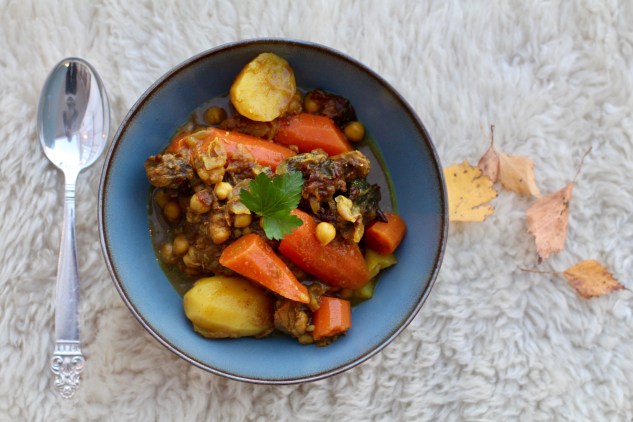 Denne gryteretten, eller ‘tagine’ som det kalles, er inspirert av det persiske kjøkken der det ofte brukes grønnsaker, tørket frukt og gjerne nøtter kokt i en aromatisk kraft sammen med kjøtt. Retten er syrlig og søt, dyp og veldig aromatisk. Perfekt for mørke høstkvelder!