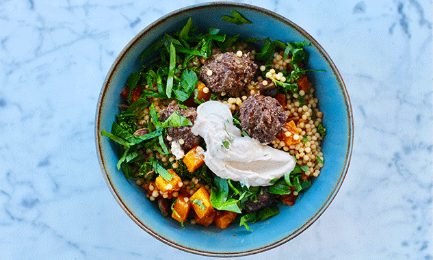 Bland couscousen med hakket persille og legg blandngen ut på et stort fat. Legg på kjøttboller og gresskarbiter, og dryss over nøtter. Legg noen spiseskjeer med tahini-saus på toppen og server resten av sausen ved siden av.
