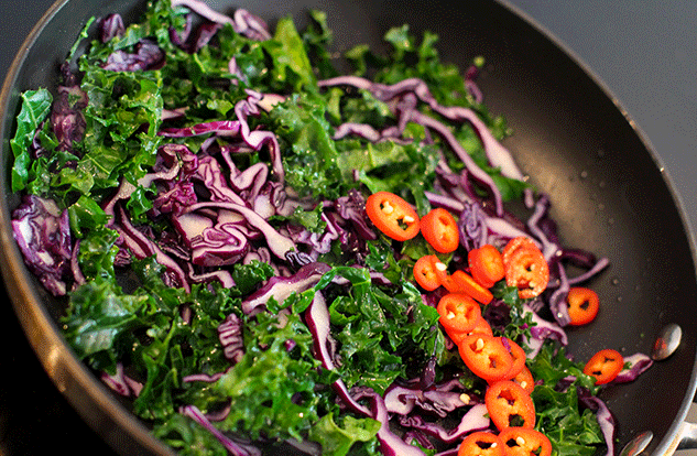 Varm opp en liten stekepanne og tilsett olje, rødkål, grønnkål, chili og litt salt og pepper. Stek på medium/høy varme under omrøring i 2-3 minutter.