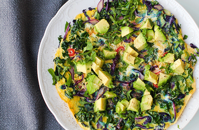 Grønnkål er også en av mine favoritter. Den er som rødkålen stappfull av godsaker for kroppen, og den kan tilberedes på en haug av måter så man blir aldri lei. Den kan spises rå; massert inn med en god olivenolje og sitronsaft og et dryss med revet parmesan, bakt i ovnen til deilige sprø grønnkålchips, den kan stekes i litt kokosolje og smakes til med tørket chilli og salt, puttes i gryter eller curryer, eller som her; i en omelett. Bare husk å fjerne den harde stilken; den er ikke god.