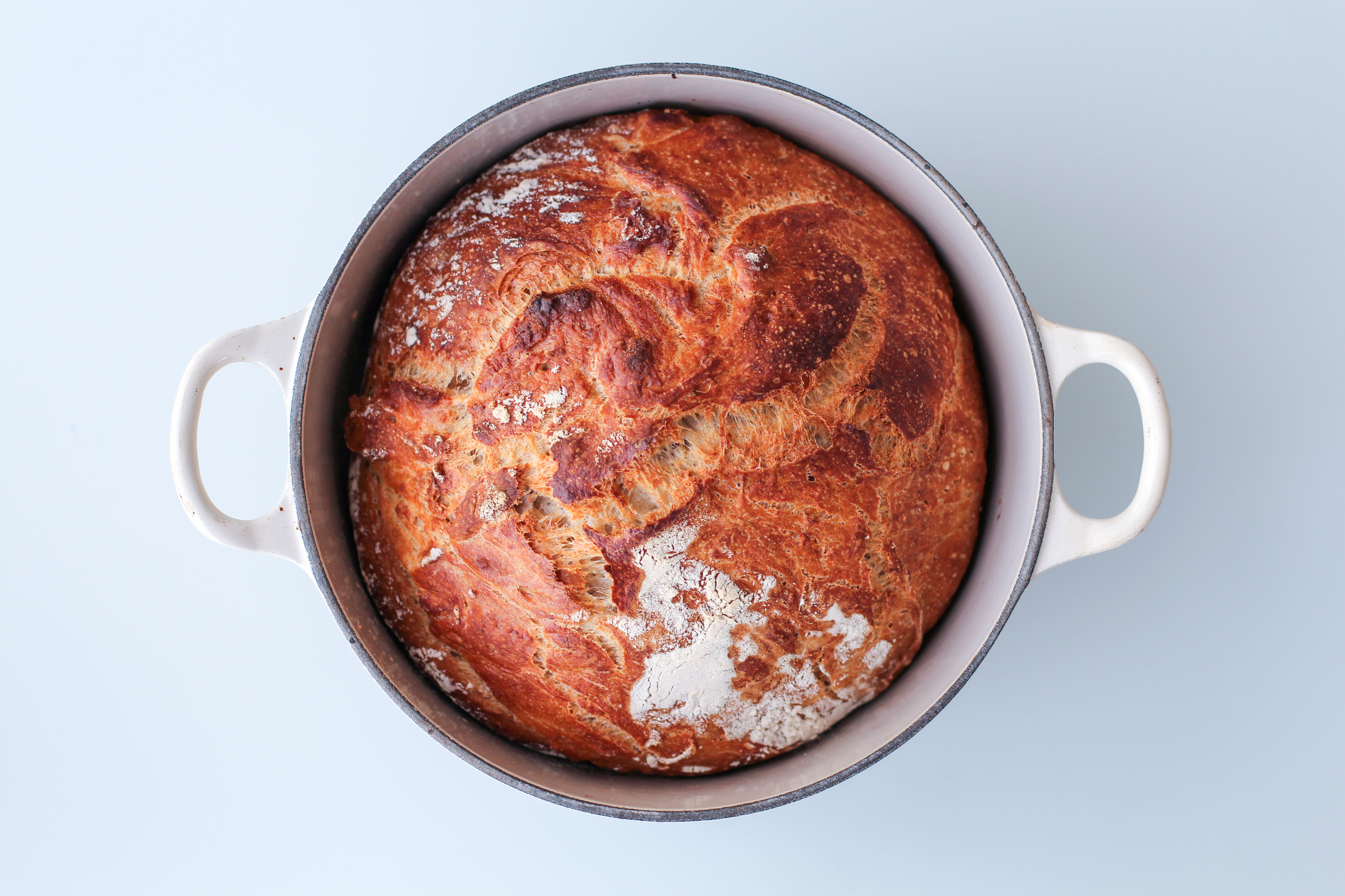 Dagen etter: hell deigen ut på et melet bakebord og ’brett’ den sammen fire ganger. Legg deigen på et melet bakepapir og legg den tilbake i bollen. La den heve tildekket i 2 timer. Etter 1,5 time setter du en liten jerngryte med lokk inn i en kald ovn og sett ovnen på 250°C. Etter ½ time tar du gryten forsiktig ut, vender brøddeigen forsiktig oppi og setter på lokket. Sett gryten tilbake i ovnen og la den stå i 30 minutter. Ta av lokket, sett ovnen på 220°C og la det steke i 15 minutter til.