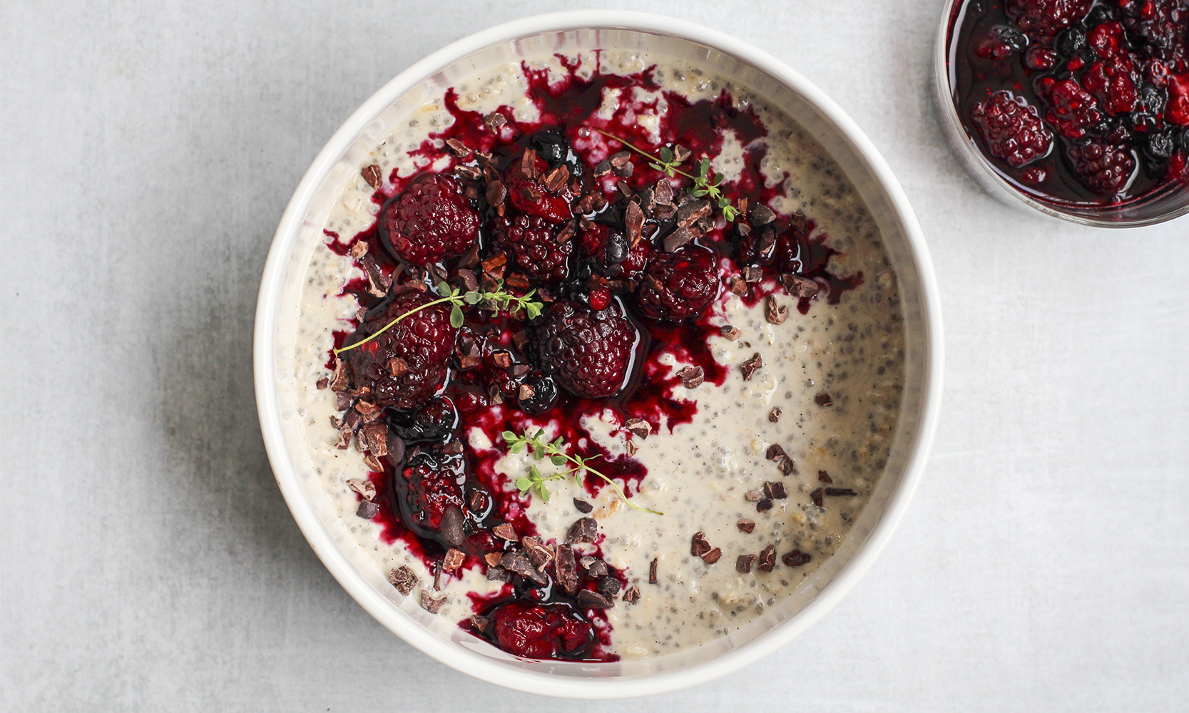 Denne digge grøten rører du sammen kvelden før, og bærene varmer du opp fem minutter før du skal spise. Altså er dette en frokost du kan unne deg når som helst.
