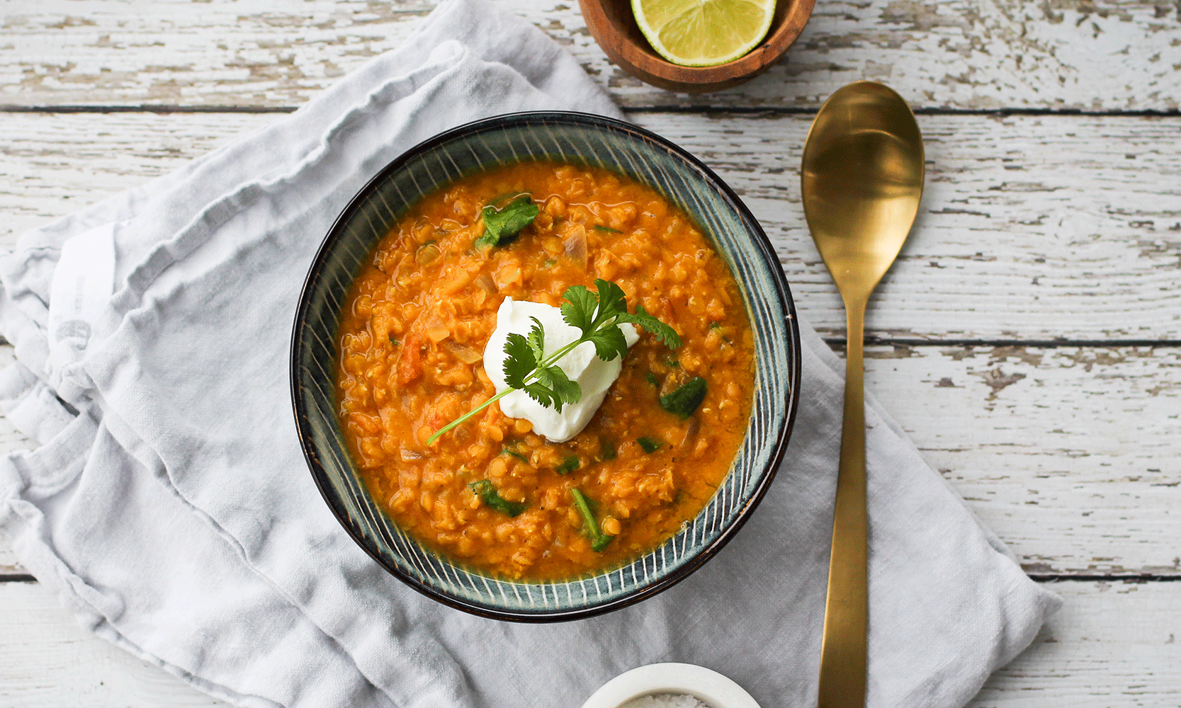 Tilsett spinat og kok et par minutter til. Smak med lime og sjekk om den trenger mer salt. Rør inn hakket koriander. Topp evt med litt yoghurt og gjerne ekstra koriander om du ønsker.
