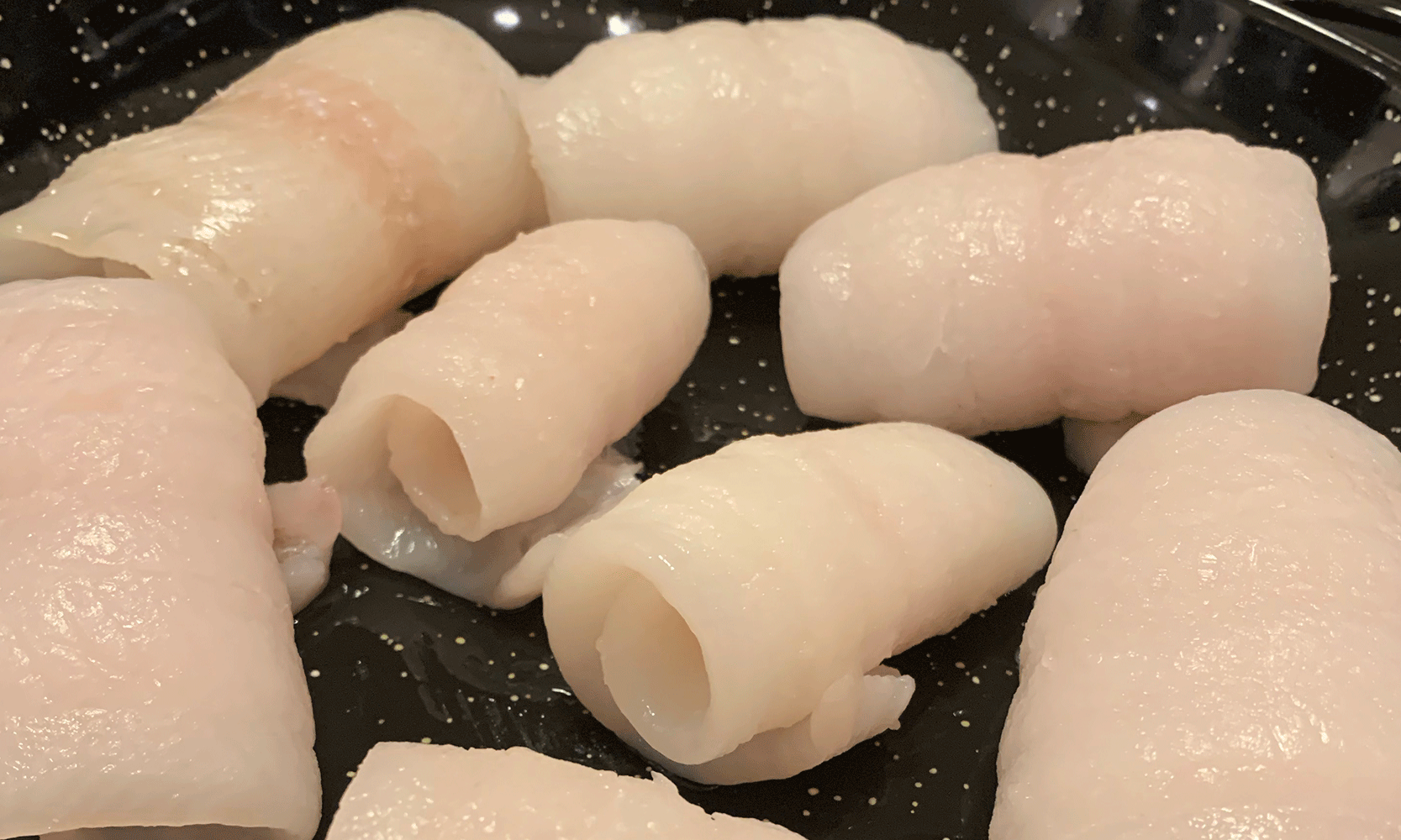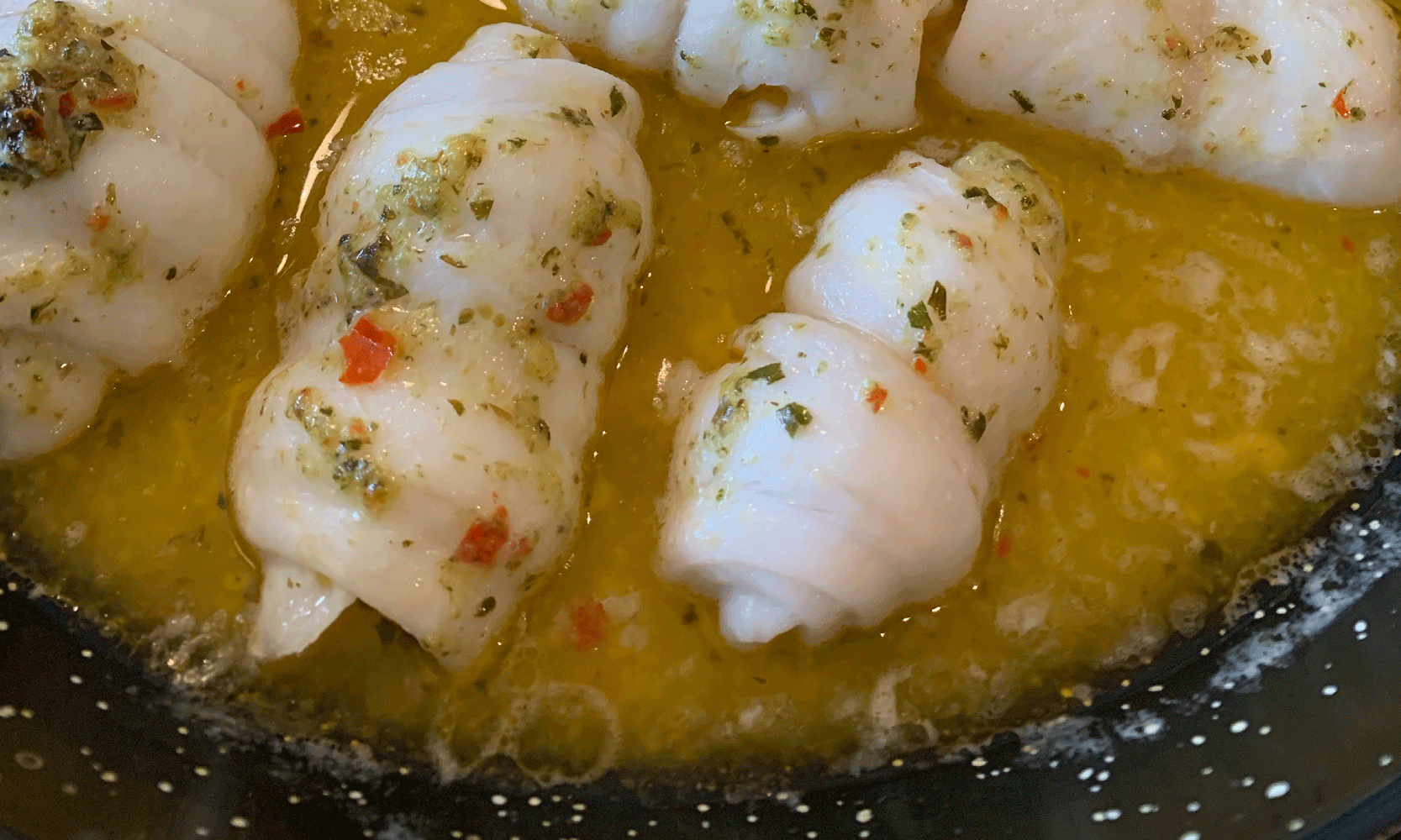 Rull fiskefiletene sammen- begynn med halepartiet (den tynneste siden) og legg dem på et fat. Prøv å la det være litt luft mellom fiskerullene. Når ovnen er klar, heller du det varme kryddersmøret over og setter formen midt i ovnen.