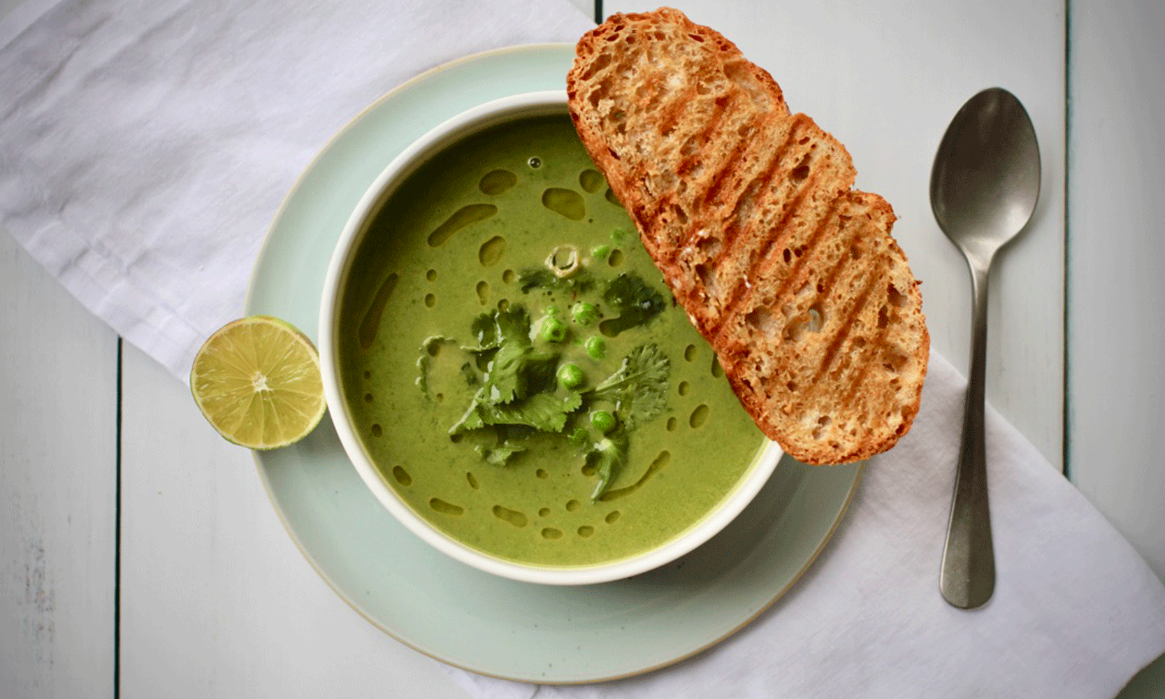 Kjør suppen fint med stavmikser eller i blender, og smak godt til med masse limesaft, og salt. Suppen har mye sødme fra kokosmelken og ertene og trenger derfor en del salt og syre for at den skal ‘synge’ i munnen. Når du får til denne balansen er suppen heeelt nydelig! Smak deg frem til den sitter 🙂