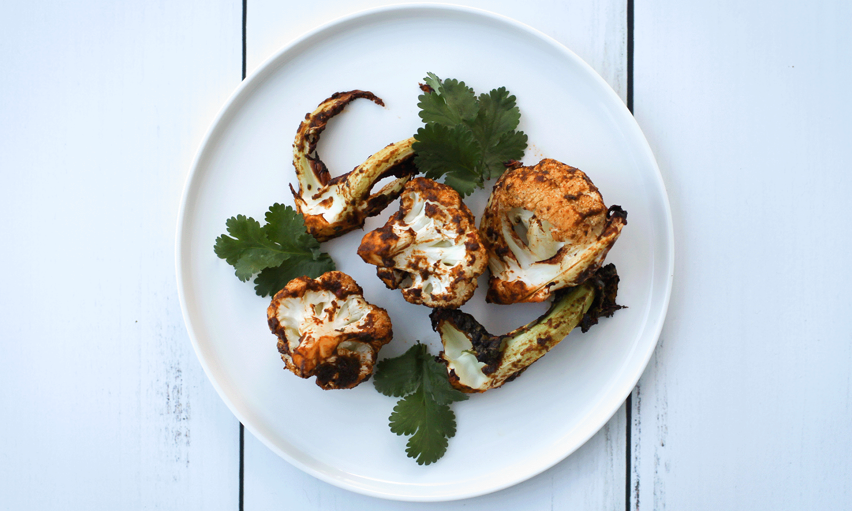 Sett ovnen på 230ºC, gjerne varmluft. Spre blomkålen godt på et stekebrett med bakepapir. Prøv å la det være litt luft mellom hver bit og pass på å få med all marinaden. Bak blomkålen i ovnen til bitene begynner å bli mørkebrune i kantene, og er såvidt gjennomstekt (sjekk med en liten spiss kniv eller en kakepinne) ca. 20 min (følg med underveis). Topp med koriander og lime og gjerne litt rømme og godt brød.