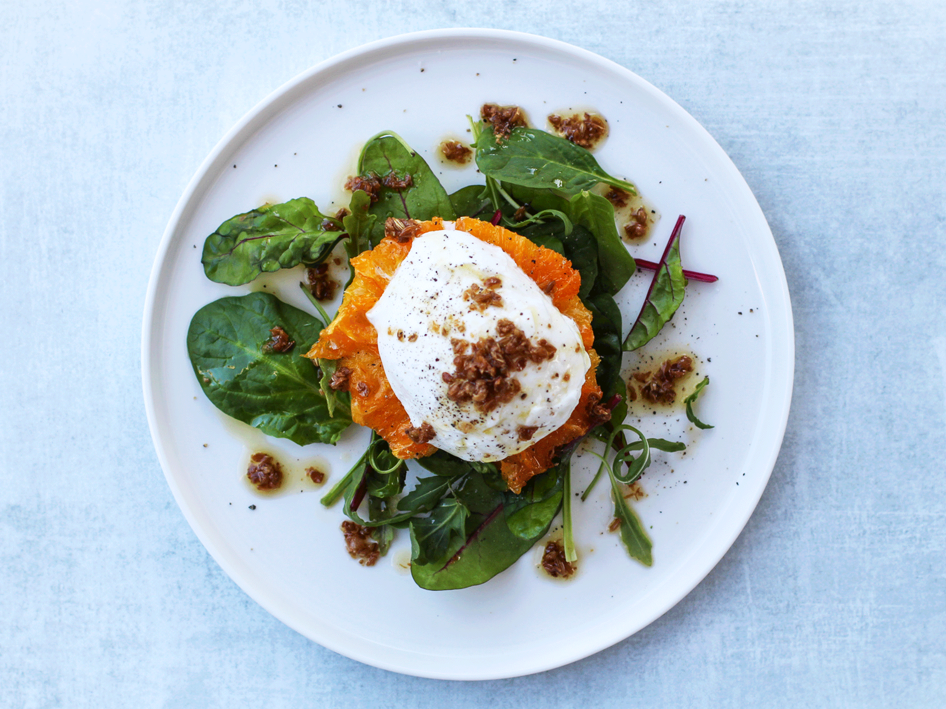 La osten renne godt av seg, tørk den godt meg kjøkkenpapir, og dryss på litt salt og pepper. Om du bruker burrata kan det være fint å fordele salat, appelsin og dressing på et stor fat, legge burrataen oppå og dele den opp foran gjestene så de kan se den kremete kjernen flyte ut. Om du bruker mozarella kan det være fint å fordele alt på fire tallerkner og servere som på bildet. Opp til deg hvordan du gjør det. Smaken blir den samme 🙂