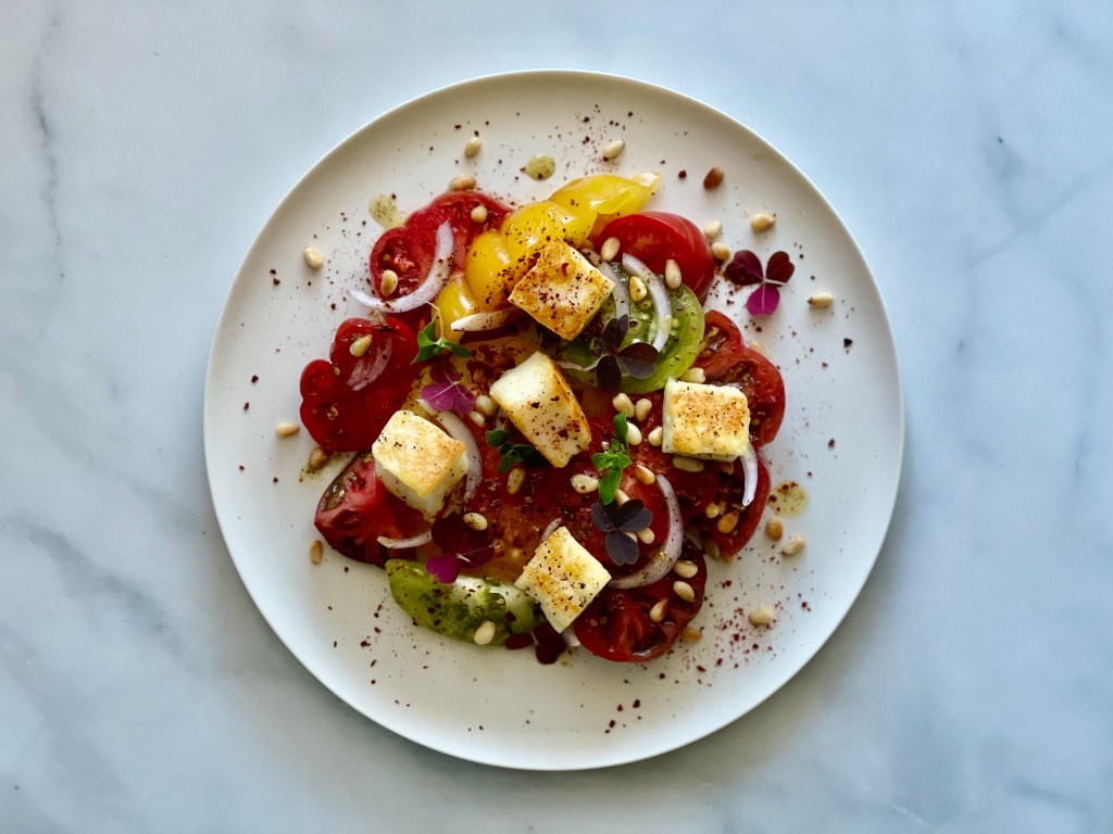 Når jeg får tak i skikkelig gode tomater, liker jeg å lage enkle salater der tomatene får skinne. Denne retten liker jeg skikkelig godt og serverer den gjerne til middag, kun med noe godt landbrød til, men den er også veldig god som en del av et større måltid. Om du ikke finner halloumi, kan du bruke fetaost, labneh eller andre typer ost. Du kan også tilsette andre proteiner som stekt kylling el. Bruk fantasien og de råvarene du liker best.