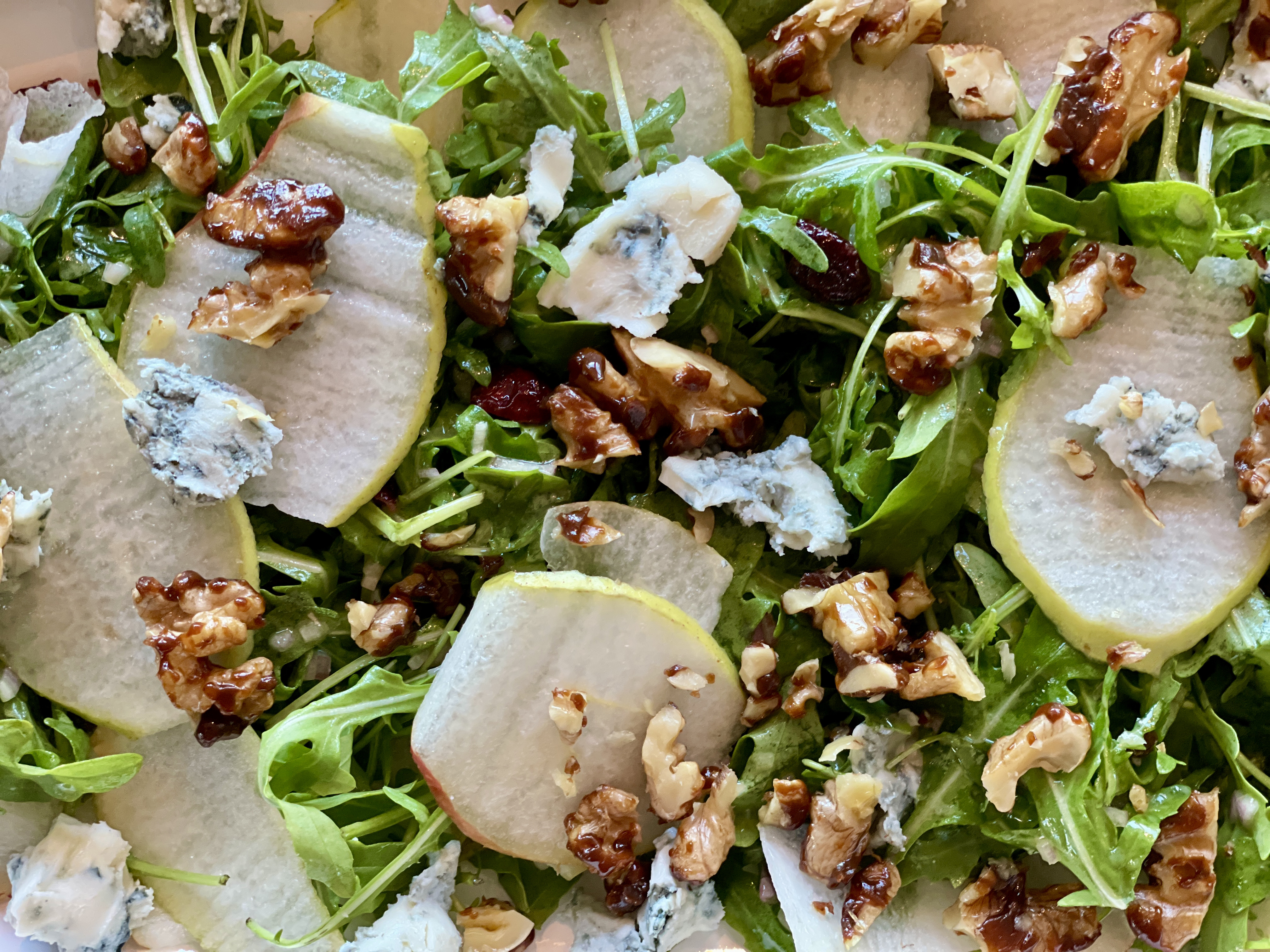 Salat: Skjær pærene i tynne skiver, gjerne med ostehøvel eller mandolin, skvis over sitronsaft og bland godt. Sitronsaften gjør at pæreskivene ikke blir brune, men tilfører også retten litt ekstra syre. Bland dressing, ruccola, tranebær og pæreskiver og legg det på et pent fat. Topp med små biter av Gorgonzola og hakket nøttecrunch. Et ekstra dryss med pepper er heller ikke feil.