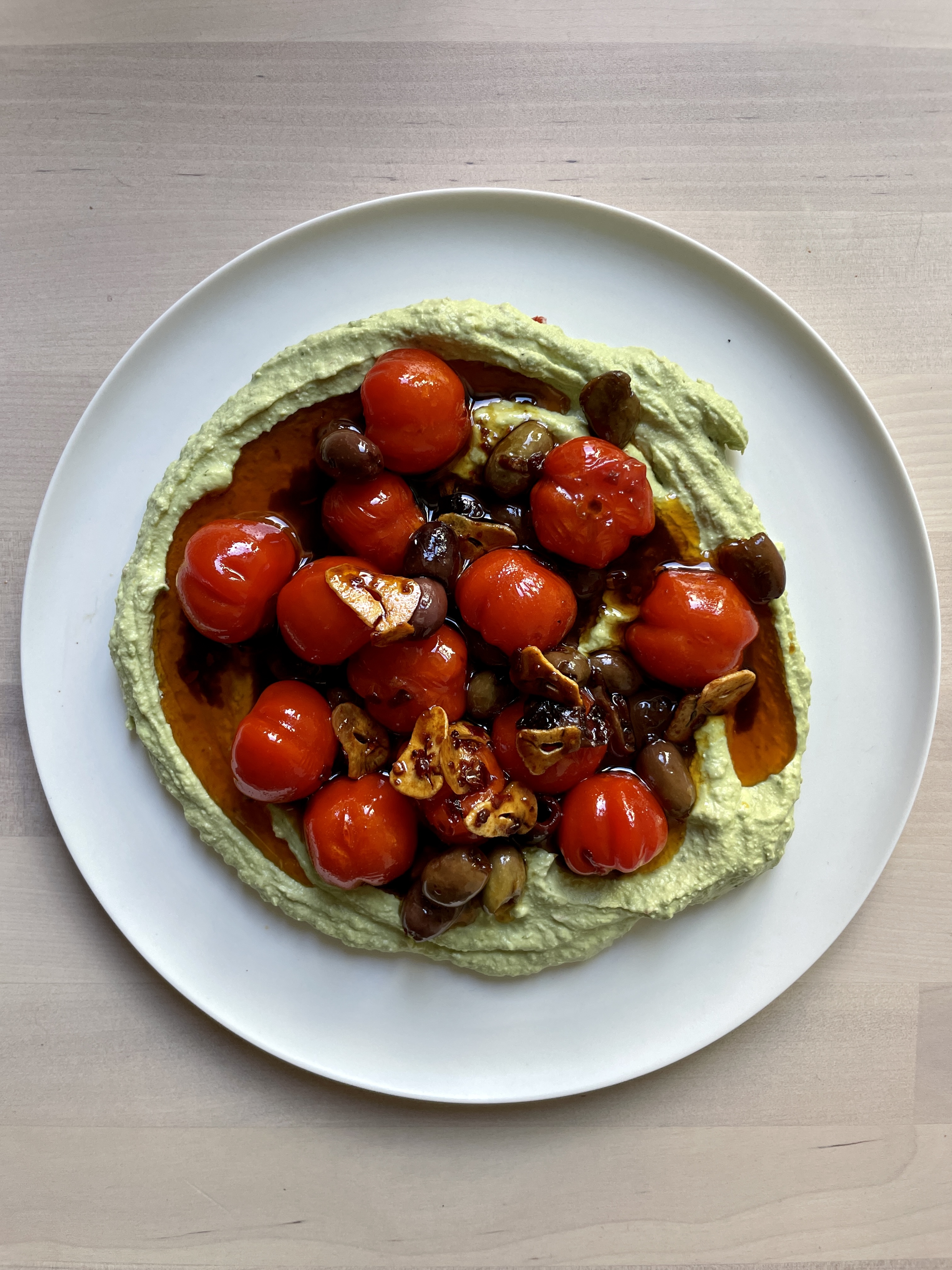 Denne!! 🤩 Dipen smaker supergodt av basilikum og feta, og toppingen popper av smaker; søte tomater, salte oliven, gyllen-stekt hvitløk (som alltid minner meg om ferie på rivieraen) i en deilig blanding av olivenolje, chili og balsamico.