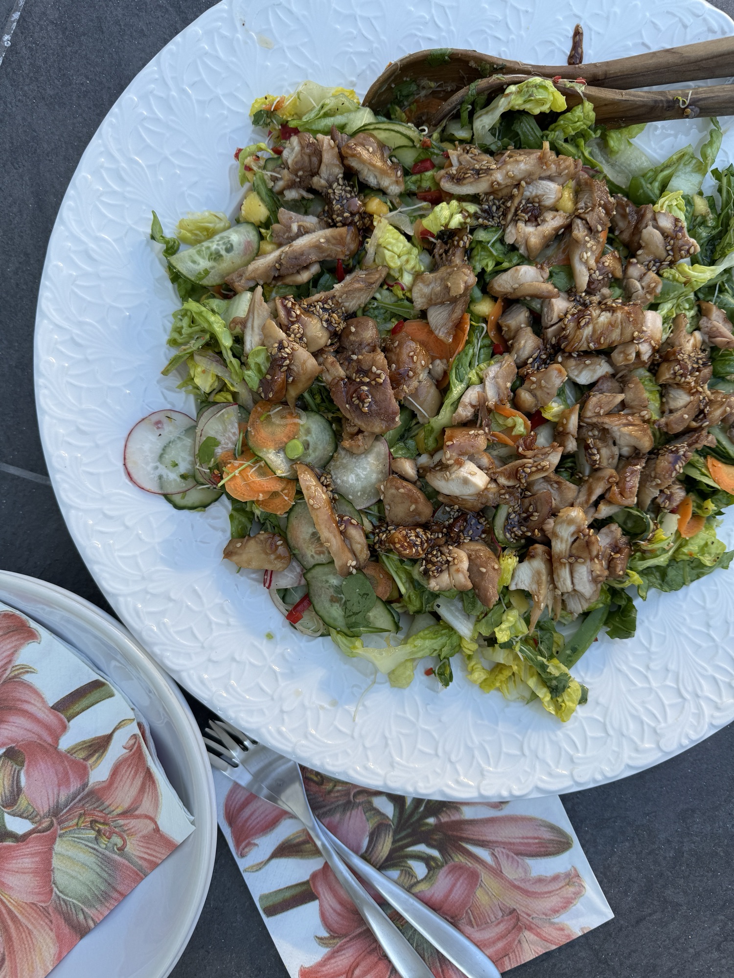 Bland alle ingrediensene til dressingen og smak godt til om den trenger mer syre, sødme eller salt. Bland dressingen med alle grønnsakene i en stor bolle og legg salaten over på et pent fat. Legg over kjøttstykker, og dryss over resten av den knuste risen.